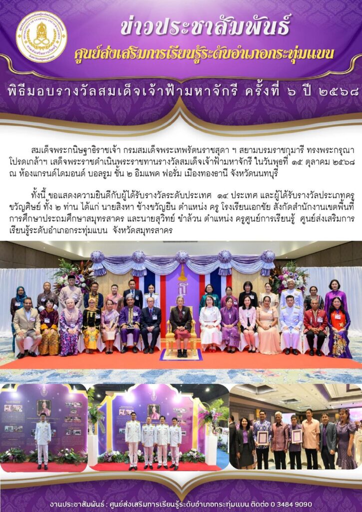 สมเด็จพระกนิษฐาธิราชเจ้า กรมสมเด็จพระเทพรัตนราชสุดา ฯ สยามบรมราชกุมารี ทรงพระกรุณาโปรดเกล้าฯ เสด็จพระราชดำเนินพระราชทานรางวัลสมเด็จเจ้าฟ้ามหาจักรี ในวันพุธที่ ๑๕ ตุลาคม ๒๕๖๘ ณ ห้องแกรนด์ไดมอนด์ บอลรูม ชั้น ๒ อิมแพค ฟอรั่ม เมืองทองธานี จังหวัดนนทบุรี ทั้งนี้ ขอแสดงความยินดีกับผู้ได้รับรางวัลระดับประเทศ ๑๔ ประเทศ และผู้ได้รับรางวัลประเภทครูขวัญศิษย์ ทั้ง ๒ ท่าน ได้แก่ นายสิงหา ช้างขวัญยืน ตำแหน่ง ครู โรงเรียนเอกชัย สังกัดสำนักงานเขตพื้นที่การศึกษาประถมศึกษาสมุทรสาคร และนายสุวิทย์ ขำล้วน ตำแหน่ง ครูศูนย์การเรียนรู้ ศูนย์ส่งเสริมการเรียนรู้ระดับอำเภอกระทุ่มแบน จังหวัดสมุทรสาคร